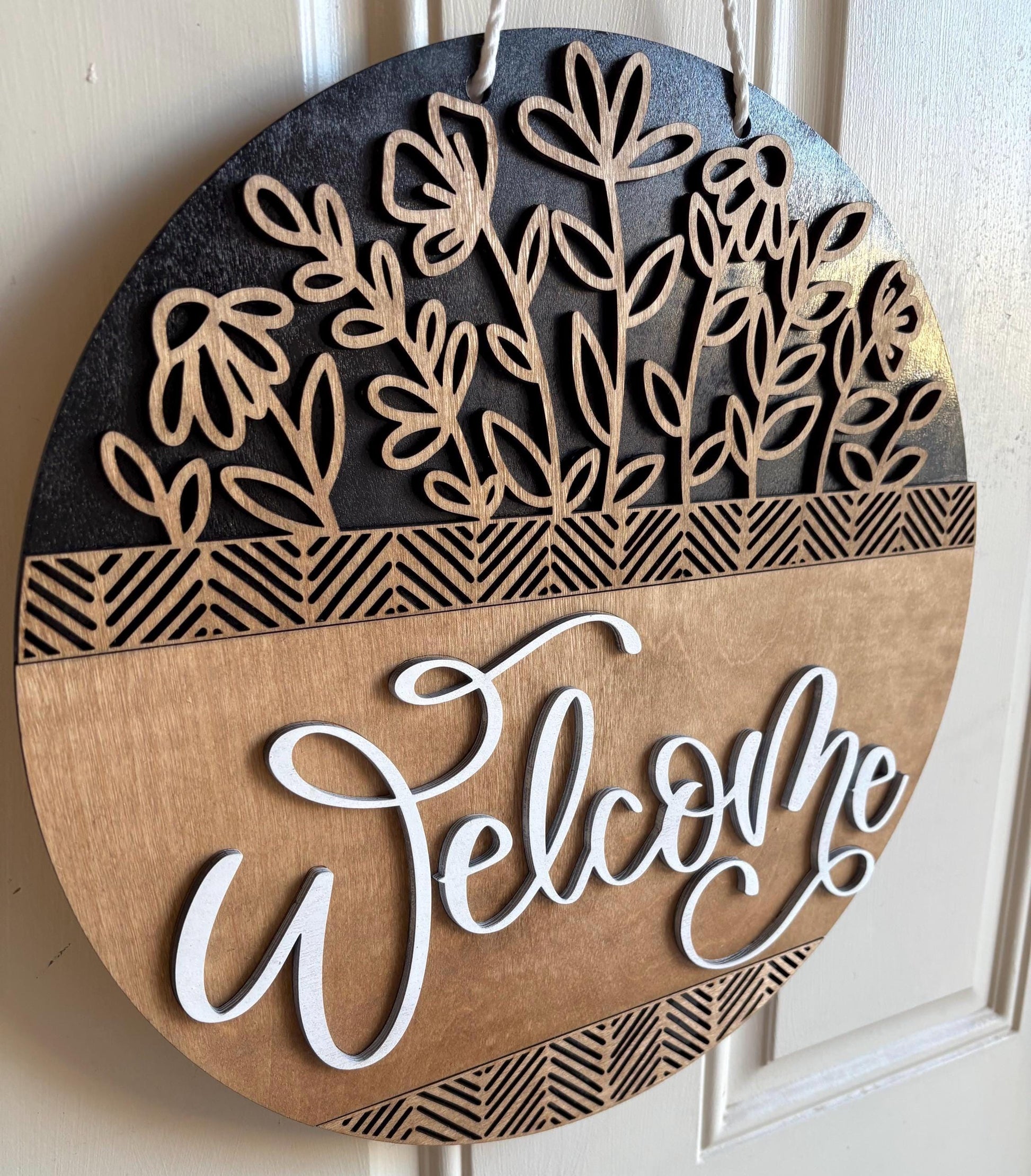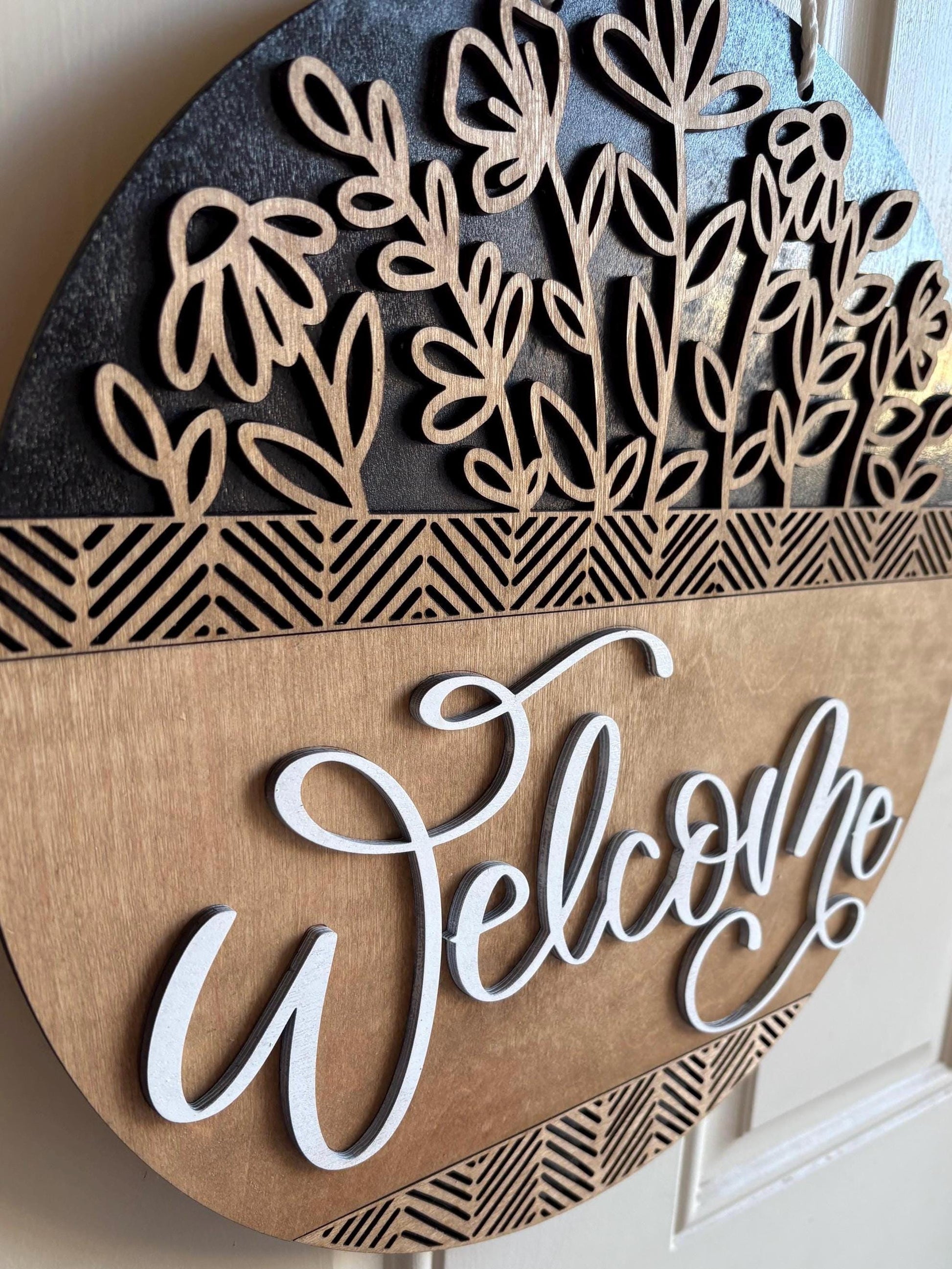 Add a warm, handmade touch to your entryway with this beautiful laser cut wooden Floral Welcome sign. Made from layered wood with a mix of natural, black, and white finishes, it features floral cutouts and handpainted detailing for a rustic yet modern look.