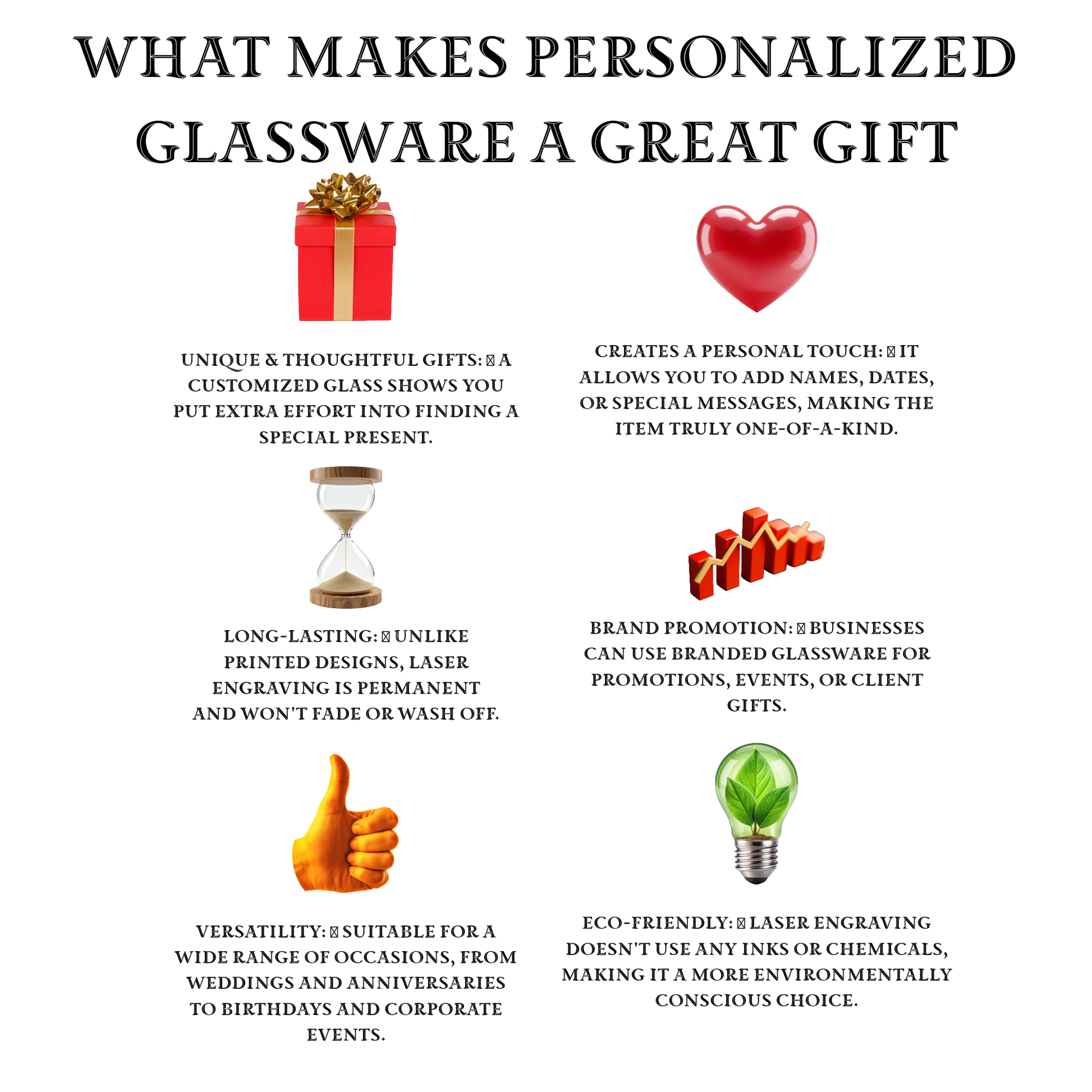 Permanent Engraving: Your design is laser-etched directly onto the glass for a frosted, high-quality finish that won't wear away.